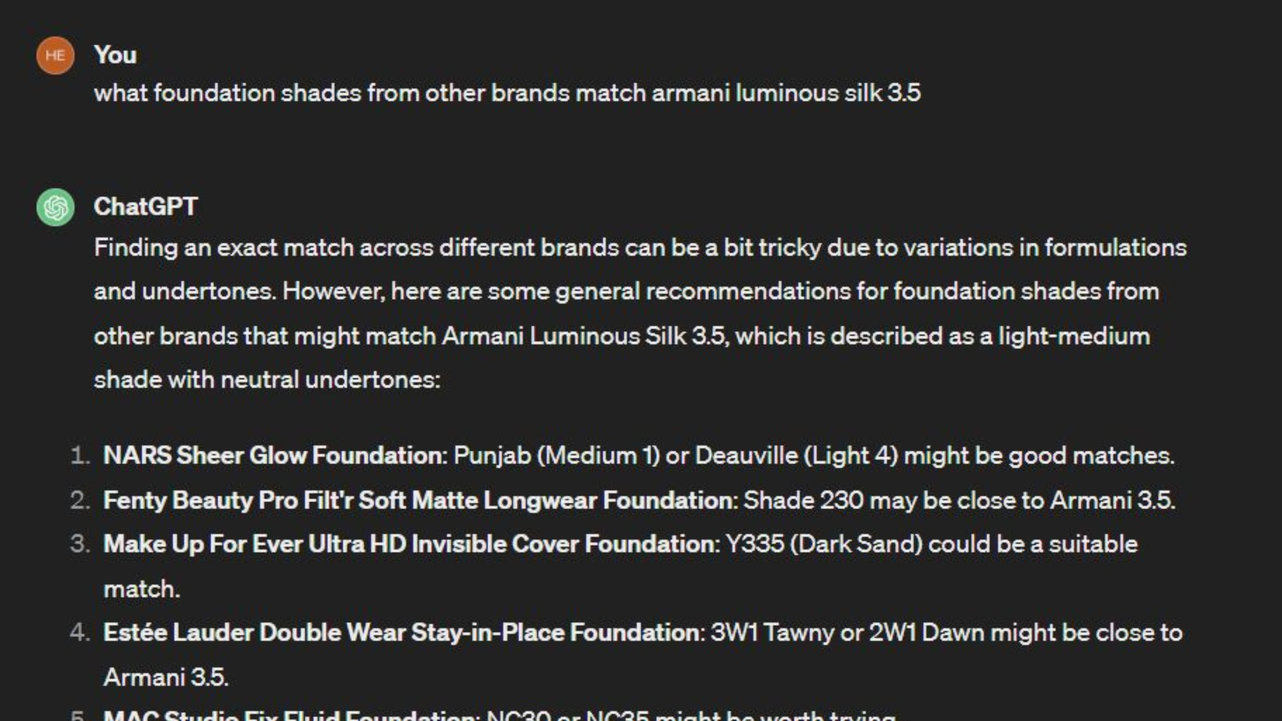 If you know your foundation shade in one well-known brand, you can ask ChatGPT to suggest alternative shades from other brands. This isn’t new, as foundation databases have existed for a long time now but it’s a lot more automated this way. You can also use the hex code of your skin to ask for recommendations. Some people have reported very mixed results with this.